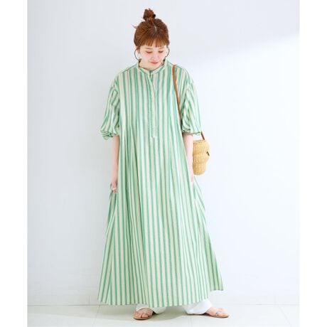 ドビーストライプ柄のインパクトのあるカラーが目を惹き、胸元のタックで顔まわりはすっきりとした印象にしています。袖口はゴムギャザーでボリュームを持たせ、動きのあるシルエットに仕上げました。マキシ丈のたっぷりとした分量感で、1枚で存在感のあるスタイリングが完成します。