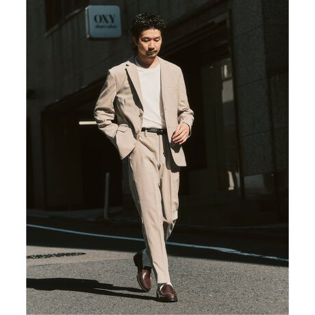 ジャケットはすっきりとしたシングルデザイン、パンツは程よくゆとりのあるシルエットで、リラックス感と上品さを両立。セットアップとしてはもちろん、それぞれ単品でも幅広いスタイリングに対応します。