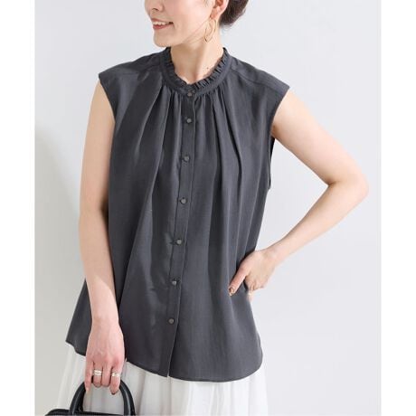 セルロースに麻をミックスした天然と合線のハイブリット素材を使用し、涼しげな麻のタッチに柔らかさとボリューム感を持たせました。衿元はプチフリルを挟んだスタンドカラーで、衿ぐりにタックとギャザーを入れて立体感を出しています。ボックスシルエットのシンプルなデザインで、微光沢のあるメタルボタンも素材との対比でアクセントに。