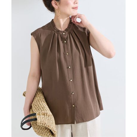 セルロースに麻をミックスした天然と合線のハイブリット素材を使用し、涼しげな麻のタッチに柔らかさとボリューム感を持たせました。衿元はプチフリルを挟んだスタンドカラーで、衿ぐりにタックとギャザーを入れて立体感を出しています。ボックスシルエットのシンプルなデザインで、微光沢のあるメタルボタンも素材との対比でアクセントに。