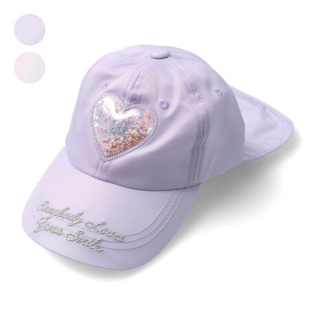 ネットショップと専門店、セレクトショップなどでの限定のアイテム!直営店では直営オンラインショップ「こどもの森e-shop」各店のWEB店限定のみでの販売になります。【直営実店舗での販売はありません。】夏のお出かけやレジャーにオススメなキャップ、帽子。キラキラ光るスパンコール入りのハートが可愛い。つばの部分のキラキララメの入ったロゴの刺繍もポイント!女の子心をくすぐる可愛さ♪日よけのたれはマジックテープで取り外し可能。また日よけの内側に保冷剤を入れるポケット付きです。(保冷剤は付きません。)UVカット加工。全サイズあごゴム付です。【アイテム】 雑貨 カジュアル お洒落 オシャレ かわいい 可愛い 普段着 デイリーウェア お出かけ 子ども こども 女児 女の子 ガールズ キッズ ベビーサイズ トドラーサイズ 幼稚園 保育園 小学校 通園 通学 小学生 遠足 旅行 2026年春夏物新作 丸高衣料 小物 ラベンダー 薄紫色 レインボーカラー 虹色 キッズフォーレ