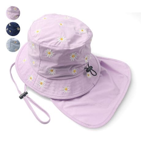 ネットショップと専門店、セレクトショップなどでの限定のアイテム!直営店では直営オンラインショップ「こどもの森e-shop」各店のWEB店限定のみでの販売になります。【直営実店舗での販売はありません。】デイジーのお花の総柄刺繍が可愛いハット、帽子!日除けのたれ部分には保冷剤を入れるポケット付き。UVカット加工で日焼けを防止。撥水、はっ水加工なのでちょっとした水遊びやアウトドアにも最適!内側のバンドに汗をすばやく吸収して乾かす吸水速乾素材を使用しているます!機能性もあり、夏のお出かけやレジャーにオススメなアイテム。【アイテム】 雑貨 カジュアル お洒落 オシャレ かわいい 可愛い 普段着 デイリーウェア お出かけ 子ども こども 女児 女の子 ガールズ キッズ ベビーサイズ トドラーサイズ 幼稚園 保育園 小学校 通園 通学 小学生 遠足 旅行 2026年春夏物新作 丸高衣料 小物 フラワー ラベンダー 薄紫色 ネイビー 紺色 サックス 水色 キッズフォーレ
