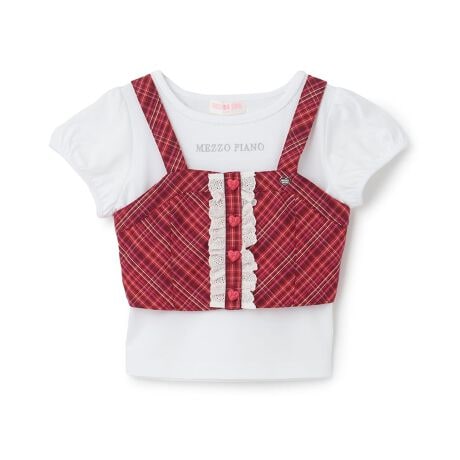 お姉さんっぽい上品な雰囲気を演出するビスチェと半袖Tシャツのセットです。オリジナルのチェック柄をベースに、フリルレースやハートリボンのボタンをあしらいました。それぞれ単品使いができ、さまざまなコーデをお楽しみいただけるアイテム。ボトム(品番:6062101)を合わせると、セットアップスタイルが完成します。