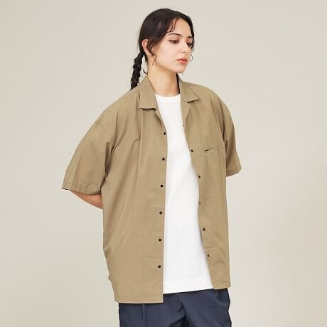 首元は抜け感のあるオープンカラー仕様で、見た目にも涼しげな印象に。ほどよくゆとりを持たせたシルエットで、一枚着としてはもちろん、Tシャツの上から軽く織るスタイルにも対応します。