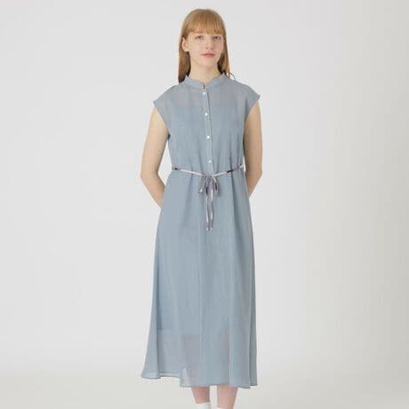 [型番:55J31785__]◆シャリ感のあるシアーストライプ素材のドレス【Design】ストライプ状の繊細な透け感が、軽やかな表情を演出するドレス。斜めに切り替えたウエストラインが自然なスタイルアップを叶えます。ノースリーブ仕様で軽快さをプラスしつつ、スタンドカラーとフロントボタンがきちんと感のある印象に。一枚でさらりと着こなせる、洗練されたサマードレスです。【Fabric】