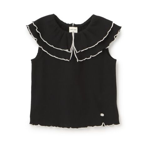 生地を重ねた大きな衿が目を引くTシャツです。