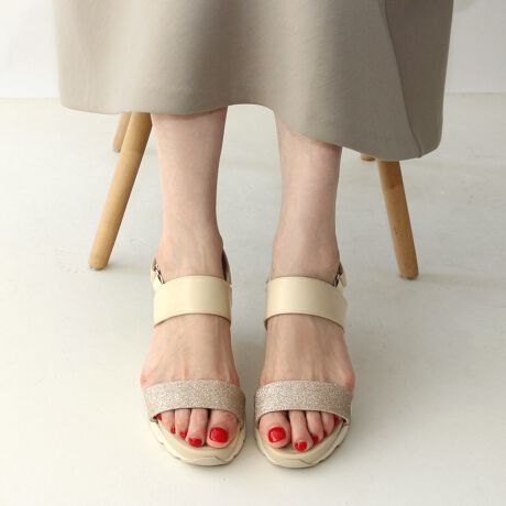 キラキラのグリッターが足元を華やかに彩るFin(フィン)のグリッター厚底ベルクロスポーツサンダルが登場しました。今季も大注目の厚底スニーカーソールは5.4cmと程よい高さなので楽なのにスタイルアップも叶うのが嬉しい。細やかなグリッターがカジュアルなデザインの中に女性らしさも演出してくれるので大人の女性もコーデに取り入れやすい一足に仕上げました。
