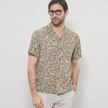 リラックスムード満点の半袖オープンカラーシャツです。程よい膨らみと落ち感のある上質な素材感でカジュアルになり過ぎず、程よくきれい目なスタイルにも合わせられます。英国らしいペイズリー柄をトーナルな配色で上品にまとめました。