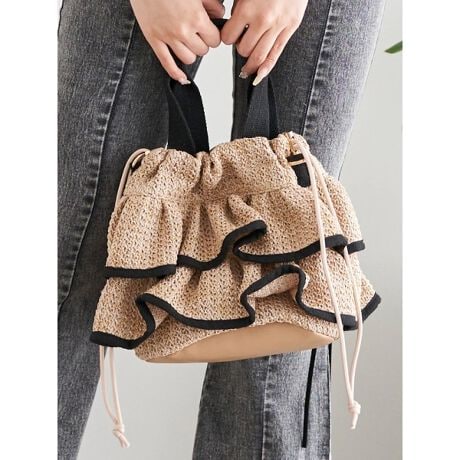 [型番:26570361733]ひらりとしたフリルに配色パイピングを施した巾着バッグ。付属のショルダーストラップを付ければ、ななめ掛けとしてもお使いいただけます。スタイリングにシーズンムードを取り入れてくれるアイテム。ワンピースやデニムスタイルと合わせたスタイリングもおすすめです。