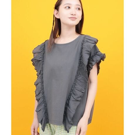 袖と前身頃にあしらったフリルが、こなれ感のあるデザインです。