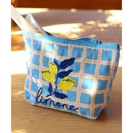 カラフルなチェックとレモンなどのモチーフ刺繍がポイントのポーチ。