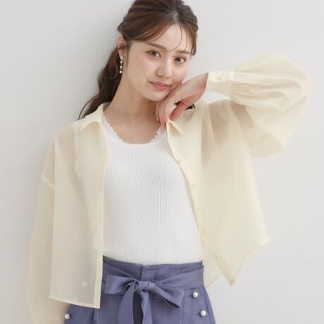 パール調ボタン・オーガンジーショート丈シアーシャツ