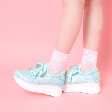 スニーカーの素材は、リボン柄のレースと大きなストーンがついたスニーカー。
