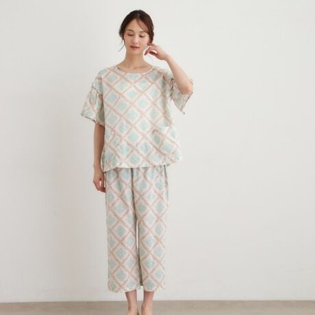 五分袖のフレアスリーブと、少し短めの八分丈パンツが軽やかなデザインのスリープウエアです。