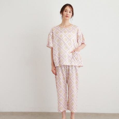 五分袖のフレアスリーブと、少し短めの八分丈パンツが軽やかなデザインのスリープウエアです。