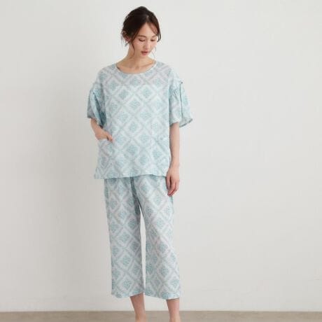 五分袖のフレアスリーブと、少し短めの八分丈パンツが軽やかなデザインのスリープウエアです。