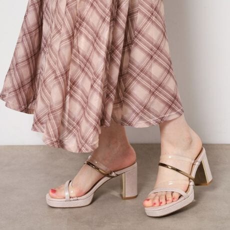 PVC×メタリックのアシンメトリーなストラップが甲をしっかりホールドしてくれます。