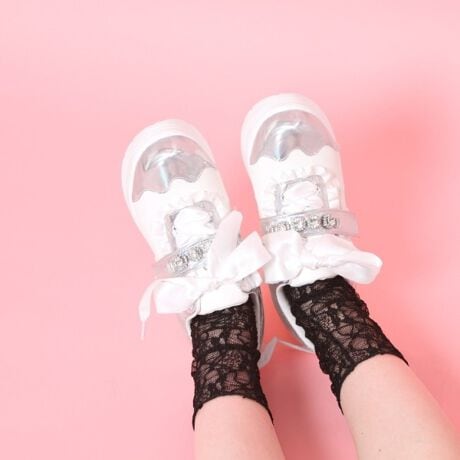 ひもの部分もサテン素材のリボンを使っているので足元ガーリー感アップ。