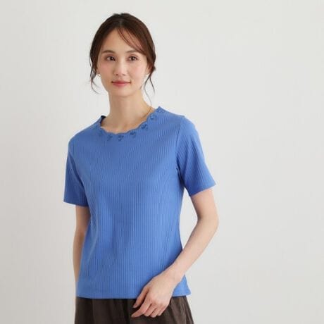 首元に施された小花の同色刺繍とスカラップデザインが、さりげない華やかさを演出するカットソーです。