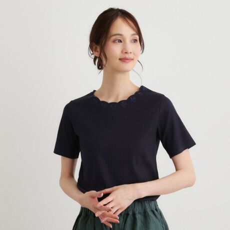 首元に施された小花の同色刺繍とスカラップデザインが、さりげない華やかさを演出するカットソーです。