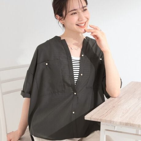 衿元が特徴的なデザインのVネックシャツ。