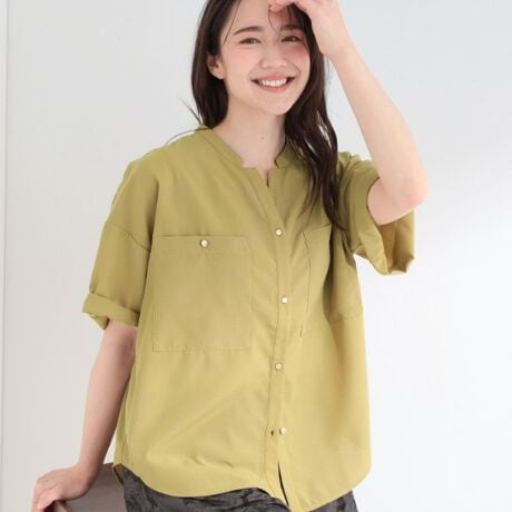 衿元が特徴的なデザインのVネックシャツ。