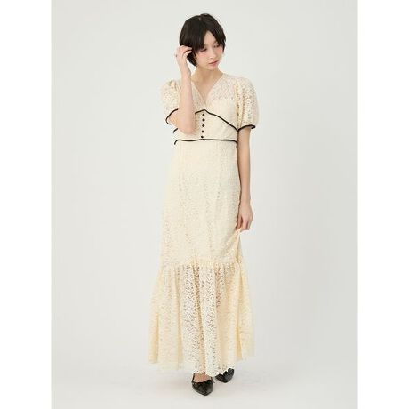 透け感のある繊細な総レースを贅沢に使用した、クラス感溢れるロングドレス。ネック周りにはレース端のスカラップを活かし、まるでヴィンテージドレスのような情緒ある佇まいに仕上げました。美しく開いたデコルテラインが顔周りをすっきりと見せ、随所に施したパイピングがシルエットに心地よいメリハリをプラス。タイトすぎず、かつボディラインを艶やかに拾うレディライクなシルエットが、纏う人の気品を優雅に引き立てます。