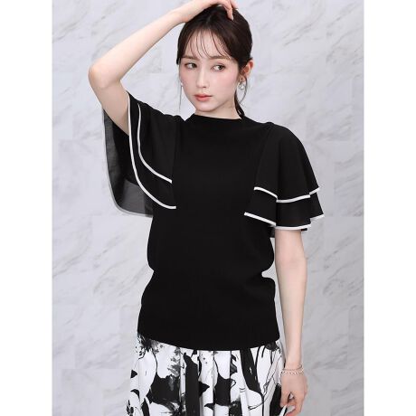 ノースリーブニットにフレアスリーブを重ね、身頃はコンパクトなシルエットに仕上げました。
