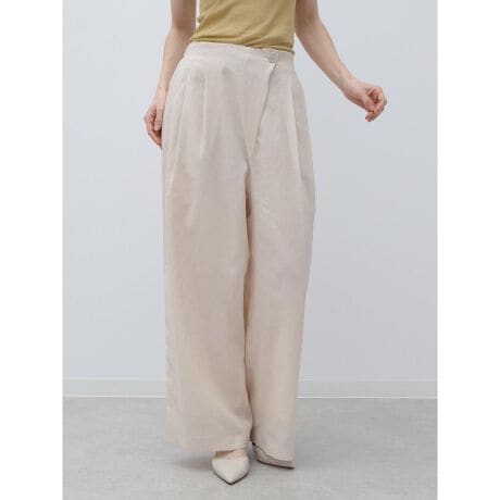 アシンメトリーなウエストがこなれ感のあるワイドパンツ。計算されたタックによって、左右で見え方が変わるフォルムに仕上げました。腰まわりはすっきりと見せつつ、裾に向かって美しく広がるワイドラインがメリハリのあるシルエットに。フロントには機能的なポケットを配し、デザイン性と実用性を両立。セットアップでの着用はもちろん、単品使いでもモードからカジュアルまで幅広いテイストに馴染みます。