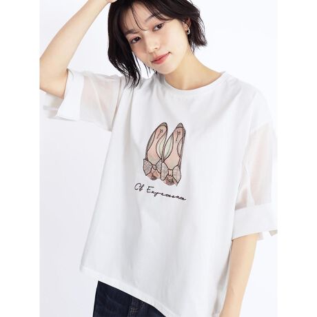 バレエシューズモチーフが目を惹く、大人可愛いプリントTシャツ。
