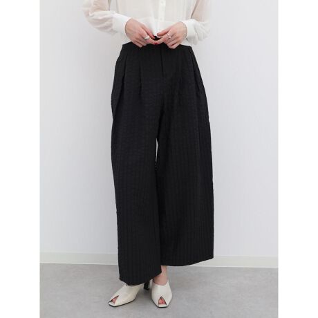 凹凸感のある生地がシーズンムードを演出するワイドパンツ。縦ラインを強調するストライプ柄が、ワイドなシルエットでも自然なスタイルアップを叶えます。腰回りもすっきりと見せてくれるウエストデザインで、タックインスタイルにもおすすめ◎、きれい見えとリラックスした履き心地を両立。デイリーに使いやすく、大人らしいきちんと感もプラスした一枚です。