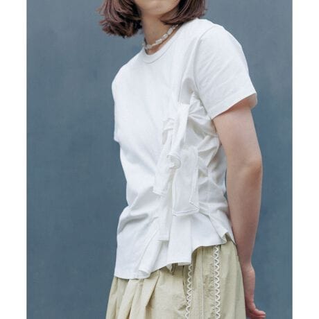 サイドのリボンディテールにより好みのシルエットで着用可能なデザインTシャツ。