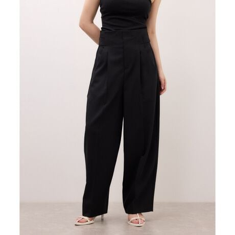 ハイウエストで、ややバレルシルエットのスラックス。