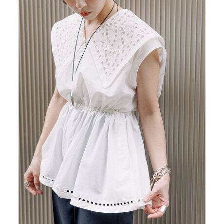 後ろ襟のスカーフ見えする三角形デザインや、裾周りにも入ったカットワーク刺繍もポイント。