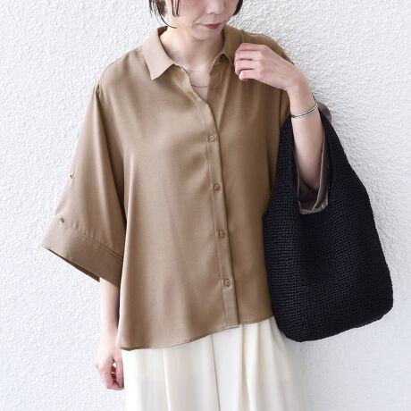 袖のアレンジで2WAYの着こなしが楽しめる、とろみ素材のシャツ。