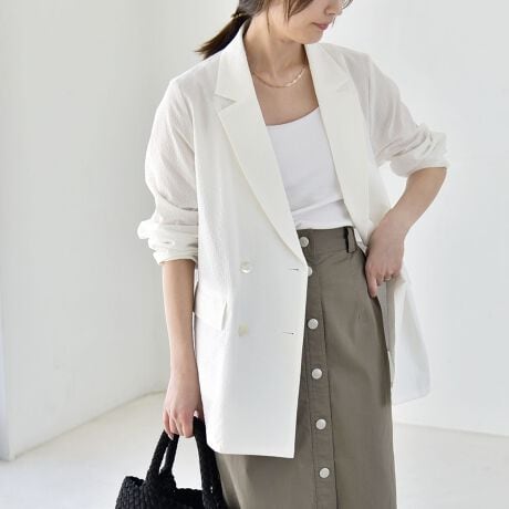 きちんと感のあるダブルブレストデザインを、夏にぴったりなカラミ素材で仕立てたジャケット。