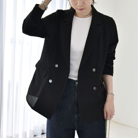 きちんと感のあるダブルブレストデザインを、夏にぴったりなカラミ素材で仕立てたジャケット。