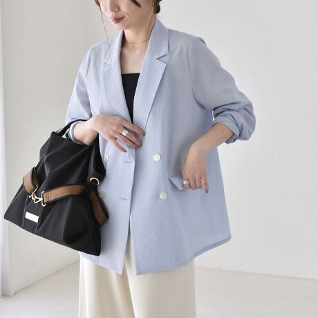 きちんと感のあるダブルブレストデザインを、夏にぴったりなカラミ素材で仕立てたジャケット。