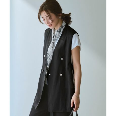 トレンドのシアー素材を取り入れた、軽やかな着心地のジレです。ノーカラーですっきりとしたシルエットに仕上げ、サイドにはDカンを施してアクセントをプラスしました。Tシャツやカットソーの上にさらっと羽織るだけで、いつものスタイリングがぐっと洗練された印象に変わります。気になる腰回りをカバーしつつ、縦のラインを強調してスタイルアップも叶えます。ボトムスを選ばず、パンツスタイルでクールに決めるのがおすすめ。オンオフ問わず幅広いシーンで活躍するアイテムです。カラーは、シックで万能なブラック系(#005)、柔らかく女性らしいベージュ系(#033)、深みのある色味が大人っぽいダークブラウン系(#035)の3色展開です。