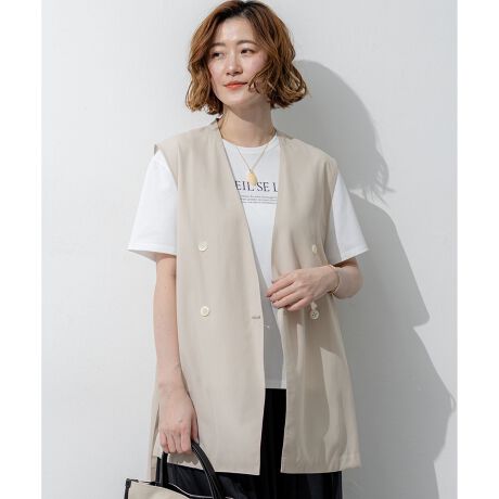 トレンドのシアー素材を取り入れた、軽やかな着心地のジレです。ノーカラーですっきりとしたシルエットに仕上げ、サイドにはDカンを施してアクセントをプラスしました。Tシャツやカットソーの上にさらっと羽織るだけで、いつものスタイリングがぐっと洗練された印象に変わります。気になる腰回りをカバーしつつ、縦のラインを強調してスタイルアップも叶えます。ボトムスを選ばず、パンツスタイルでクールに決めるのがおすすめ。オンオフ問わず幅広いシーンで活躍するアイテムです。カラーは、シックで万能なブラック系(#005)、柔らかく女性らしいベージュ系(#033)、深みのある色味が大人っぽいダークブラウン系(#035)の3色展開です。