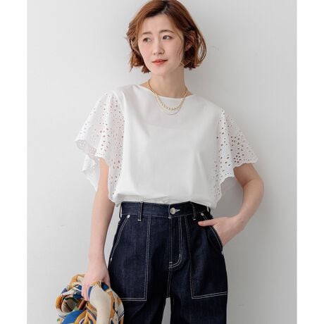 シンプルな身頃に、大柄のスカラップ刺繍を施した袖をドッキングさせた華やかなトップスです。袖にはたっぷりと分量を持たせつつ、大胆なカットワーク刺繍を施すことで、軽やかで涼しげな印象に仕上げました。気になる二の腕をふんわりとカバーするのもうれしいポイント。一枚着るだけで洗練されたコーディネートが華やぎ、デニムやワイドパンツと合わせて大人のカジュアルスタイルを楽しむのはもちろん、テーパードパンツやスカートと合わせればお出かけシーンにも活躍します。 カラーは、爽やかで万能なホワイト(#001)、シックでモダンな印象のブラック(#005)、肌馴染みが良く上品なキャメル(#034)、落ち着いた雰囲気のダークブラウン(#035)の4色展開です。