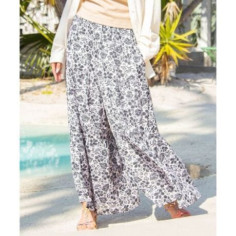 [型番:4CA-6213-2026]軽やかなシアー感が魅力の楊柳(ようりゅう)素材パンツ。ウエストはゴム仕様でリラックスしたはき心地を叶えます。ティアードの切り替えデザインが生み出すボリュームシルエットが華やかさを演出。ハワイに咲く花をモチーフにした三柄展開で、リゾートムード漂うコーディネートにおすすめです。