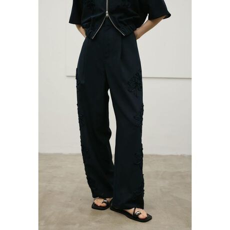 モデル身長164cm(Mサイズ着用)立体感のあるフラワーモチーフが印象的なエンブロイダリータックパンツ。共生地のフリル刺繍で仕上げたデザインが、装いにさりげない華やかさを添えます。ポリエステル100%の素材を使用した軽やかで扱いやすく、さらりとした着心地が魅力。ドライなタッチで、季節感のあるスタイリングが楽しめます。ウエストはバックゴム仕様で、リラックス感のある履き心地を叶えました。シンプルなトップスと合わせるだけで、バランスの取れた主役コーデが完成する一着です。500JSB30-1461(フラワーエンブロイダリージップシャツ)とセットアップ着用可能です。ストレッチなし、透け感ややあり(ショート丈の裏地付き、WHTのみロング丈の裏地付き)【お手入れ方法】手洗い可
