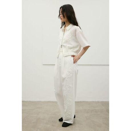 モデル身長164cm(Mサイズ着用)立体感のあるフラワーモチーフが印象的なエンブロイダリータックパンツ。共生地のフリル刺繍で仕上げたデザインが、装いにさりげない華やかさを添えます。ポリエステル100%の素材を使用した軽やかで扱いやすく、さらりとした着心地が魅力。ドライなタッチで、季節感のあるスタイリングが楽しめます。ウエストはバックゴム仕様で、リラックス感のある履き心地を叶えました。シンプルなトップスと合わせるだけで、バランスの取れた主役コーデが完成する一着です。500JSB30-1461(フラワーエンブロイダリージップシャツ)とセットアップ着用可能です。ストレッチなし、透け感ややあり(ショート丈の裏地付き、WHTのみロング丈の裏地付き)【お手入れ方法】手洗い可