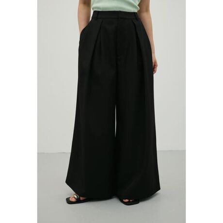 モデル身長164cm(Mサイズ着用)ロ□ウエストデザインがトレンド感を演出するタックワイドパンツ。フロントに施したタックが立体感を生み、ワイドながらもすっきりとしたシルエットに仕上げました。程よくルーズなサイズ感で、気になる腰回りや脚のラインを自然にカバー。リラックス感のある履き心地ながら、きちんと見えも叶える一枚です。コンパクトなトップスやクロップド丈と合わせれば、バランスの良い旬なスタイリングに。カジュアルからきれいめまで幅広いコーディネートに対応し、デイリーに活躍します。透け感なし、ストレッチなし。【お手入れ方法】マシンウォッシュ可