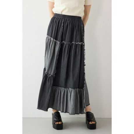 ■ポイント同じ素材を裏表で切替えることでパッチワークを再現したデザインスカート。切替部分は、断ち切りデザインでガーリーなアイテムながらカジュアル要素をプラス。軽やかなデニム素材で夏まで着用して頂けます。■ディテールアシンメトリーに切り替えたデザインスカート。シンプルなトップスと合わせてもさまになるアイテムです。■スタイリングカジュアルなグラフィックTシャツや、サマーニットとの相性が抜群。■生地4.5ozのインディゴデニムと硫化ブラックデニムを使用。製品STONE BIO+ブリーチ加工を施しています。■透け感:なし■裏 地:なし■伸縮性:なし■光沢感:なし※お取り扱い上のご注意経年変化により色落ちする場合があります。加工の特性上、多少の個体差があります。[注意事項]※画像の商品はサンプルです。実際の商品と仕様、加工が若干異なる場合があります。※画像の商品は光の照射や角度、お使いのモニター環境により、実物と色味が異なる場合がございます。※着用、お取り扱いの際は、アテンションタグをご確認ください。