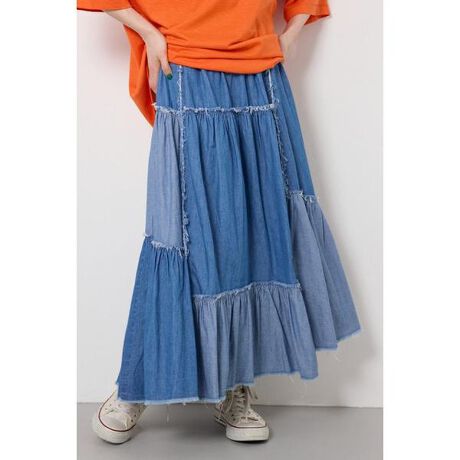 ■ポイント同じ素材を裏表で切替えることでパッチワークを再現したデザインスカート。切替部分は、断ち切りデザインでガーリーなアイテムながらカジュアル要素をプラス。軽やかなデニム素材で夏まで着用して頂けます。■ディテールアシンメトリーに切り替えたデザインスカート。シンプルなトップスと合わせてもさまになるアイテムです。■スタイリングカジュアルなグラフィックTシャツや、サマーニットとの相性が抜群。■生地4.5ozのインディゴデニムと硫化ブラックデニムを使用。製品STONE BIO+ブリーチ加工を施しています。■透け感:なし■裏 地:なし■伸縮性:なし■光沢感:なし※お取り扱い上のご注意経年変化により色落ちする場合があります。加工の特性上、多少の個体差があります。[注意事項]※画像の商品はサンプルです。実際の商品と仕様、加工が若干異なる場合があります。※画像の商品は光の照射や角度、お使いのモニター環境により、実物と色味が異なる場合がございます。※着用、お取り扱いの際は、アテンションタグをご確認ください。