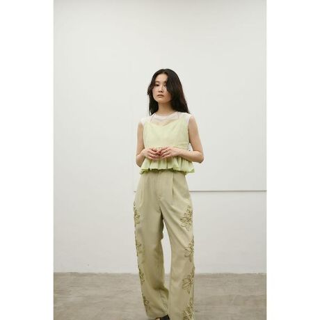 モデル身長164cm(FREEサイズ着用)キャミソールをレイヤードしたようなデザインが印象的なリネンミックスバルーンキャミ。胸下の切り替えからふんわりと広がるシルエットが、軽やかな表情を演出。オリジナルのフラワープリントは、線画タッチで甘くなりすぎず大人っぽい印象に仕上げています。裾はバルーン仕様で立体感をプラス。ショート丈デザインでバランスが取りやすく、ボトムスを選ばず着用いただきやすい一枚。ポリエステルに麻をミックスした素材を使用し、軽やかで扱いやすく、ナチュラルな風合いが魅力。天然素材特有の節感があり、表情のある仕上がりになっています。ストレッチ、透け感ややあり(裏地あり)【お手入れ方法】マシンウォッシュ可