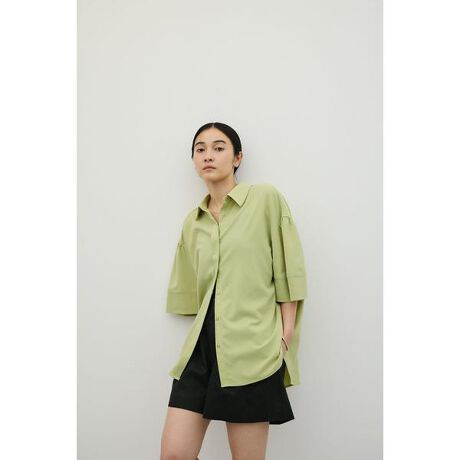 [型番:500JSM30-3261]モデル身長164cm(FREEサイズ着用)袖のギャザーと袖口にややフォルムを出したデザインがポイントのギャザーシャツ。オーバーサイズながら素材の落ち感で細見えが叶う一枚です。ドライタッチで涼しく着用できる素材感も魅力。マニッシュにもフェミニンにも着用いただけます。透け感WHTややあり、ストレッチややあり。【お手入れ方法】マシンウォッシュ可