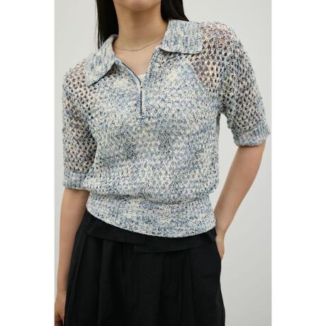 [型番:500JSM70-3921]モデル身長162cm(FREEサイズ着用)毎年大人気の3色の糸を引きそろえて編んだミックスカラーが特徴的な透かし柄ニット。ジップタイプのポロトップでカジュアルな印象に仕上げつつ、程よい透けで清涼感と抜け感のあるデザインになっています。ゆとりのあるサイズ感ながらスッキリと着用できるので幅広いスタイリングにおすすめです。ストレッチあり、透け感あり。【お手入れ方法】マシンウォッシュ可
